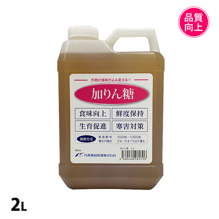 育てている野菜の 食味UP、糖度UP、えぐみ 青臭み 苦み の減少、硝酸態窒素の消化 寒害対策 など、あらゆる効果が期待できる「加りん糖」。果実、野菜、花、お茶など幅広い作物に利用できます。特殊技術により酵素コーティングされた「加りん糖」は、植物体のクチクラ層や気孔などから細胞への浸透が早く、作物の活性を最大限に発揮!天候不順時に作物の光合成を盛んにし、生育促進の効果も期待できます。食味向上、糖度UP、生育促進、農作物にプラスαの活力剤です。