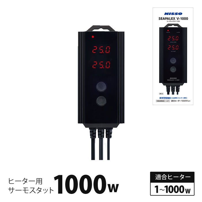 ●水温がひとめでわかる大型デジタル表示! -9.8〜69.0℃まで、0.1℃単位で表示します。-9.8℃以下は「LL」69.0℃以上は「HH」表示。 ●コンパクトなのにヒーター容量1000Wまで使用可能 1〜1000Wまでのヒーターを利用できるので、家庭用から中小規模サイズまで幅広くお使いいただけます。 ●操作が簡単! たった2つのボタンで設定が水温設定ができます。 ●充実の異常警報機能! 設定温度と水温に±3℃以上の差が発生した時やセンサーに短絡や断線の異常が発生した時に、音と光でお知らせする異常警報機能付きです。 |