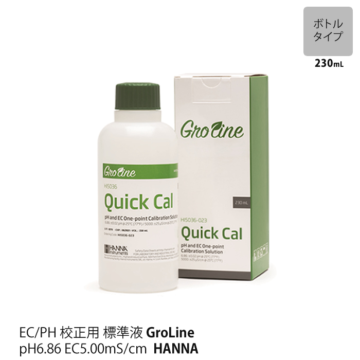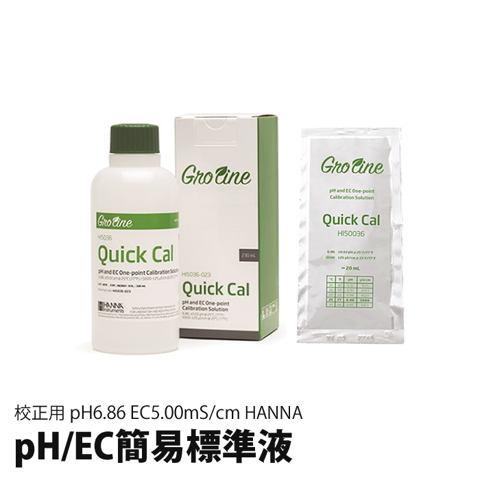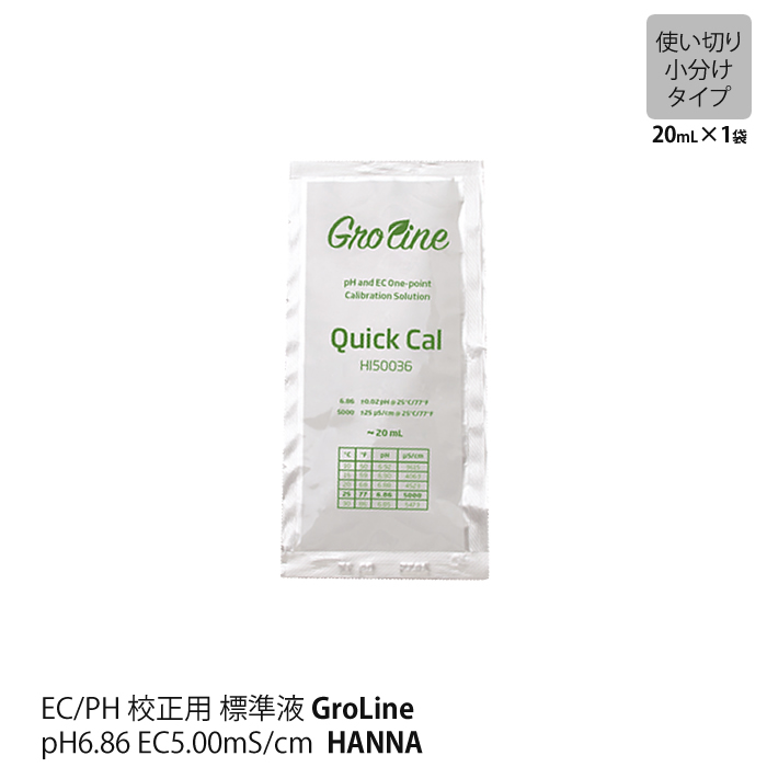 HANNA GroLine グロライン シリーズ用 で使える、ECとpHをこの1つで校正できる便利な標準液。 頻繁に使わない方には、小袋タイプをお勧めいたします。 校正は定期的に行ってくださいね。正しく行われていないと正確な数値を得られません。 |