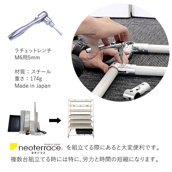 メタルジョイントの ネオテラス 組立専用 ラチェットレンチ (M6用 5mm) です。屋内用LED一体型水耕栽培システム「ネオテラス」を組み立てるときに大変助かるアイテムです。