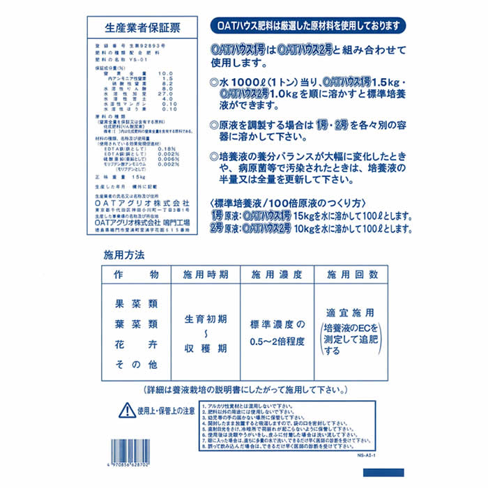 「OATハウス肥料」は、長年の養液栽培技術を生かし、高度に精製された原料を組合わせた肥料です。水耕栽培やロックウール栽培の生育に必要な養分を含む培養液として、全国に普及しています。また、養分吸収バランスがすぐれ、鉄欠乏症防止のためキレート鉄を配合することにより、各種の養液栽培や、そ菜の養液育苗用肥料としても安心して使用できます。