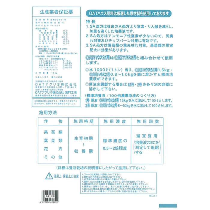 「OATハウス肥料」は、長年の養液栽培技術を生かし、高度に精製された原料を組合わせた肥料です。水耕栽培やロックウール栽培の生育に必要な養分を含む培養液として、全国に普及しています。また、養分吸収バランスがすぐれ、鉄欠乏症防止のためキレート鉄を配合することにより、各種の養液栽培や、そ菜の養液育苗用肥料としても安心して使用できます。