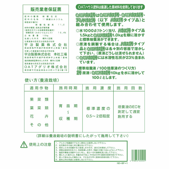 「OATハウス肥料」は、長年の養液栽培技術を生かし、高度に精製された原料を組合わせた肥料です。水耕栽培やロックウール栽培の生育に必要な養分を含む培養液として、全国に普及しています。また、養分吸収バランスがすぐれ、鉄欠乏症防止のためキレート鉄を配合することにより、各種の養液栽培や、そ菜の養液育苗用肥料としても安心して使用できます。