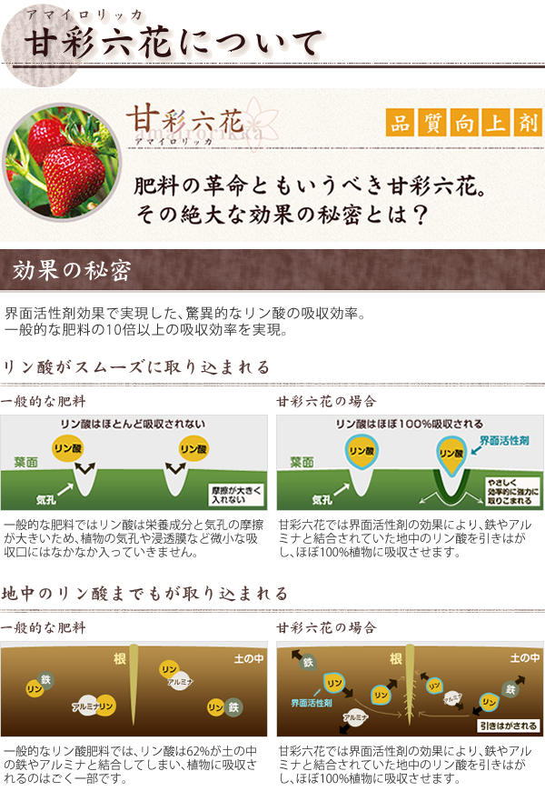 肥料の栄養分を特殊技術によりコーティングし、界面活性化させることで、高効率で作物に作用する甘彩六花。美味しさ、甘さ、色つやの向上を始め、形状改善や腐敗果の減少などで目覚ましい効果が確認されています。日本農業の進歩発展に貢献するべく、次世代の肥料がここに誕生しました。