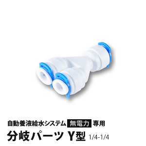 養液補給タンク(10L用または20L用)からの養液を、2つに分散させる便利な分岐パーツです。