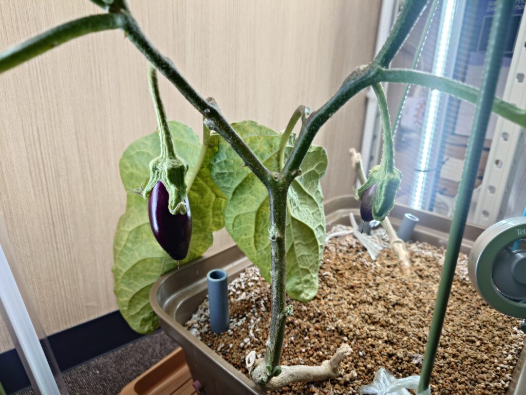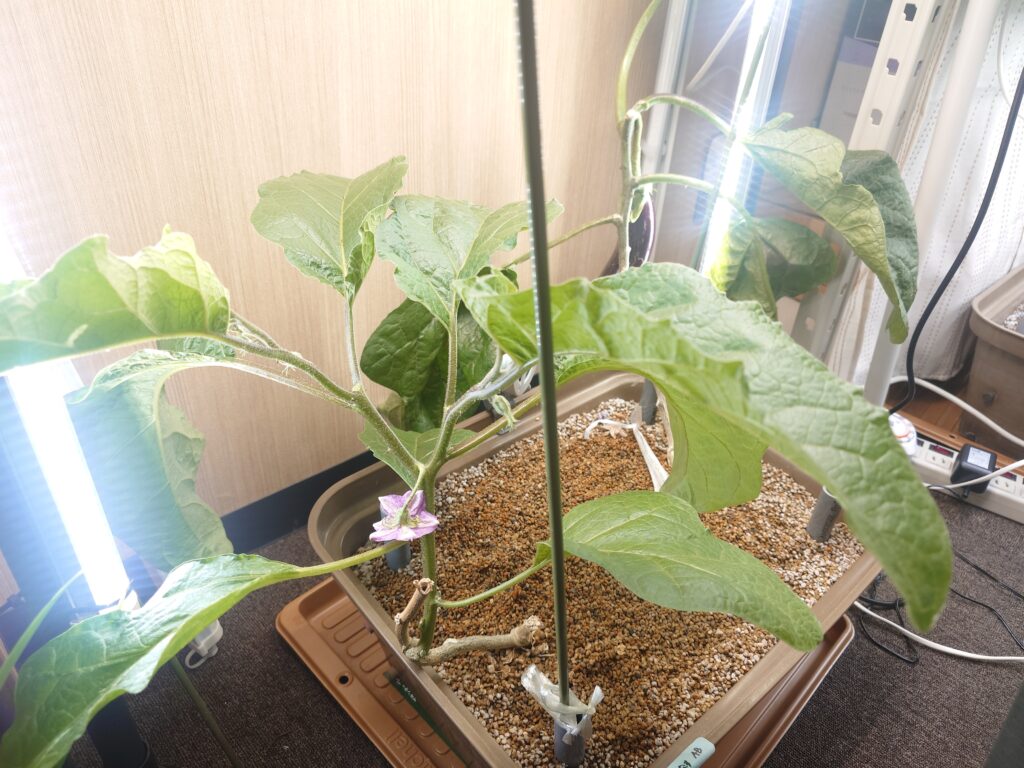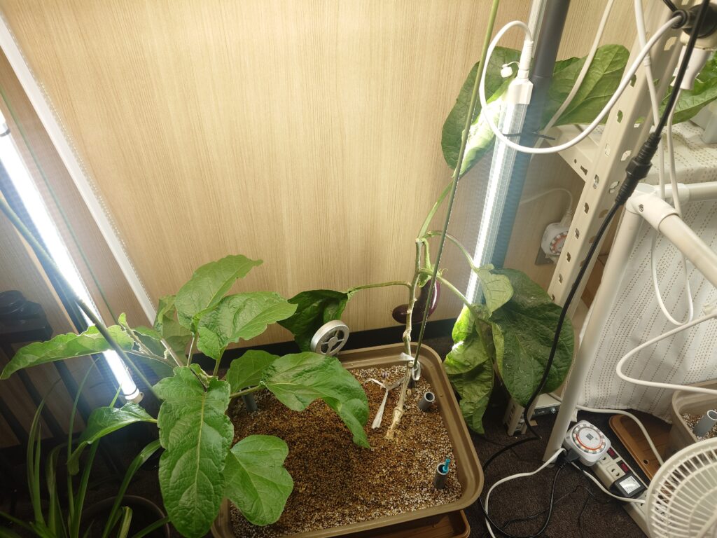 右側の実もだいぶ大きくなっていますね。LEDライトは、植物育成ライトの「おやさいライト」を使っているのですが、実のなる野菜であることと、照射距離が離れていることから、左右からも照射しています。