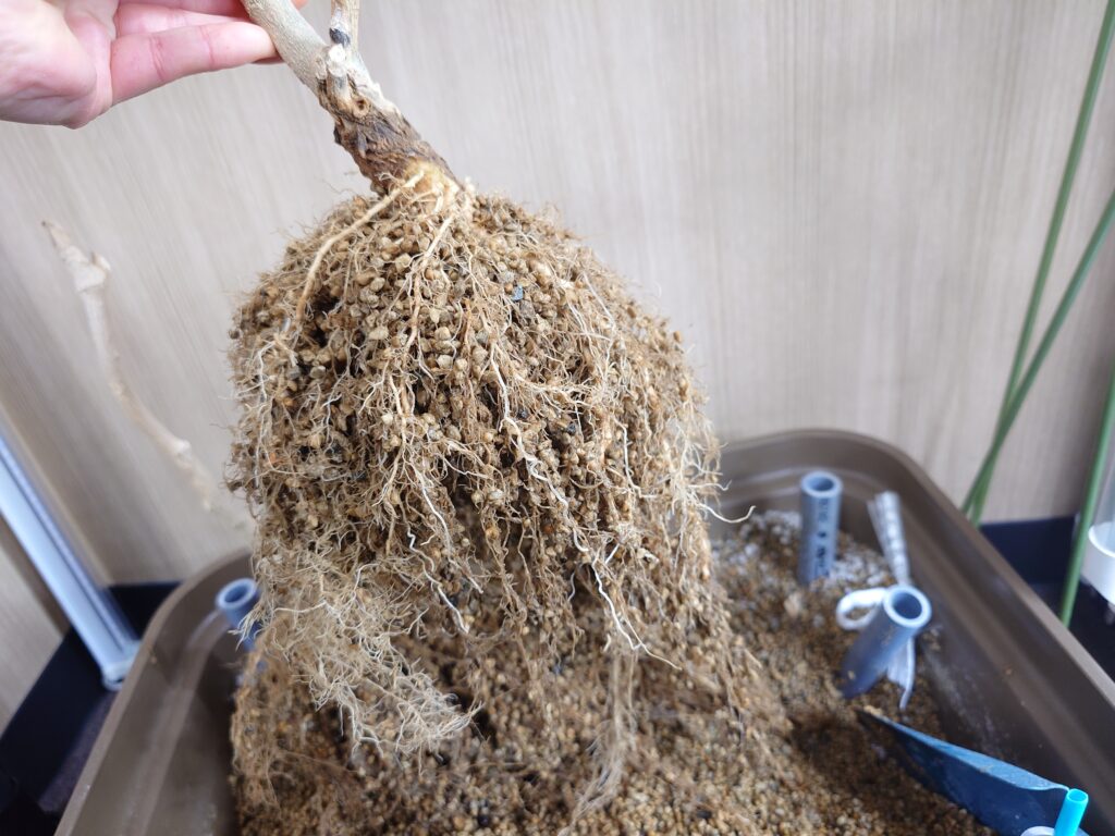 おまけですが、最後に根っこを引き抜いてみると、立派な根っこが出てきました。野菜の片付けの時には、この根っこを見て、毎回生命力を感じるというか、栽培おつかれさまと言いたくなりますね。