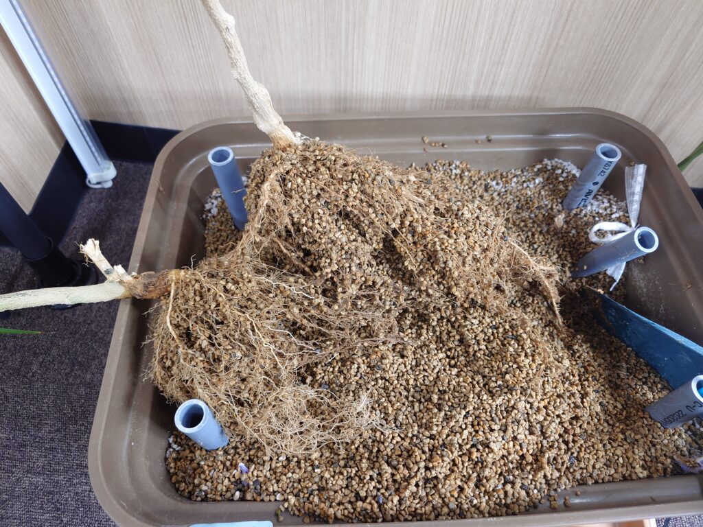 おまけですが、最後に根っこを引き抜いてみると、立派な根っこが出てきました。野菜の片付けの時には、この根っこを見て、毎回生命力を感じるというか、栽培おつかれさまと言いたくなりますね。