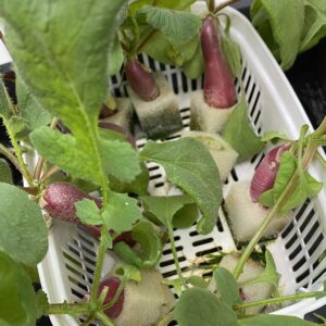 ラディッシュの葉っぱも炒め物などにすると美味しいんですが、なかなかスーパーでは手に入らないので、自分で育てたからこそ味わえる味ですね。
