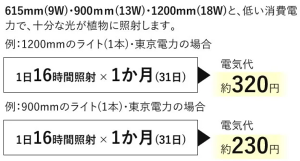 なお、先ほどの植物栽培専用おやさいライトの電気代の計算の中で照射時間を16時間と記しています。陽性植物や半陰性植物の日照時間は日光をもとに出しています。LEDライトで日光と同じくらいの効果を出すには時間的に照射時間が長くなるということです。