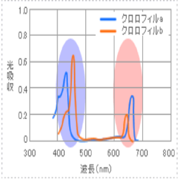 上の図は、光合成を行う際にクロロフィル(葉緑体)が吸収する光の吸収量と光の波長を示したものです。植物は光合成によりみずからの生きる栄養を作り出しています。赤(640~660nm付近)の光と、青(400~470nm付近)の光を、特異的に吸収しているのをご覧いただけると思います。