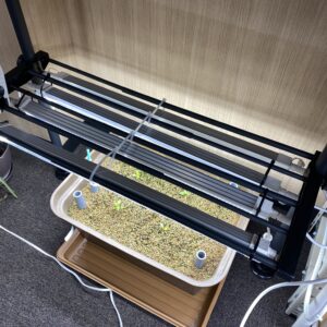 エコゲリラでは、植物育成ライト「おやさいライト」を使っています。葉っぱも広がり、幅もあるので、2本のライトで照射しました。