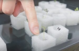 - スポンジやボラ土を水に浸し、種を1〜2粒ずつ置きます。