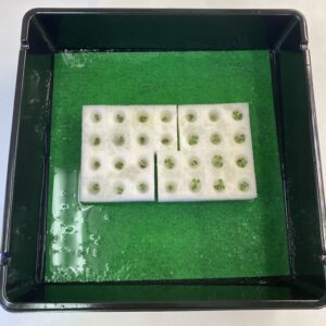 - 育苗が進んだら、栽培容器に液肥を満たし、苗を植え付けます。