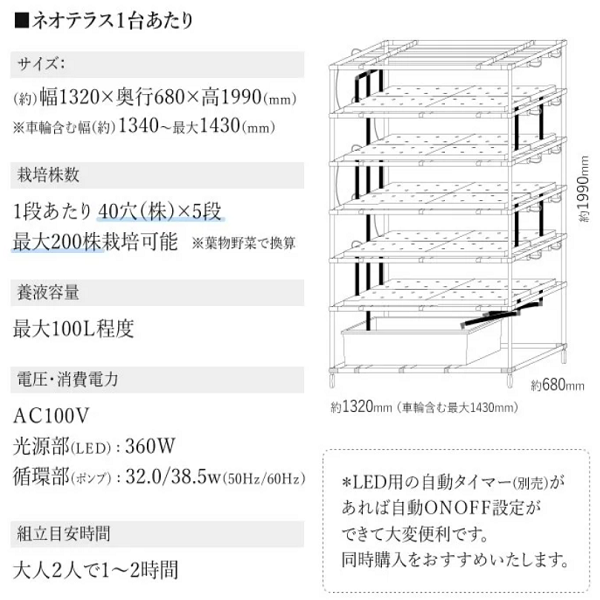 こちらの画像は1台から注文できる水耕栽培専用のネオテラス。限られたスペースを有効活用することにより満足の収穫量を実現できるということで人気が高いシステムです。