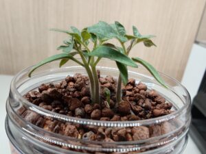 ペットボトル栽培で種をパラパラとまいて、発芽したものを間引きするタイミングで、「捨てるのがもったいないから、他の容器でも育ててみよう!」と思い、3株のうちの1株を自作のキットに移し替えました。