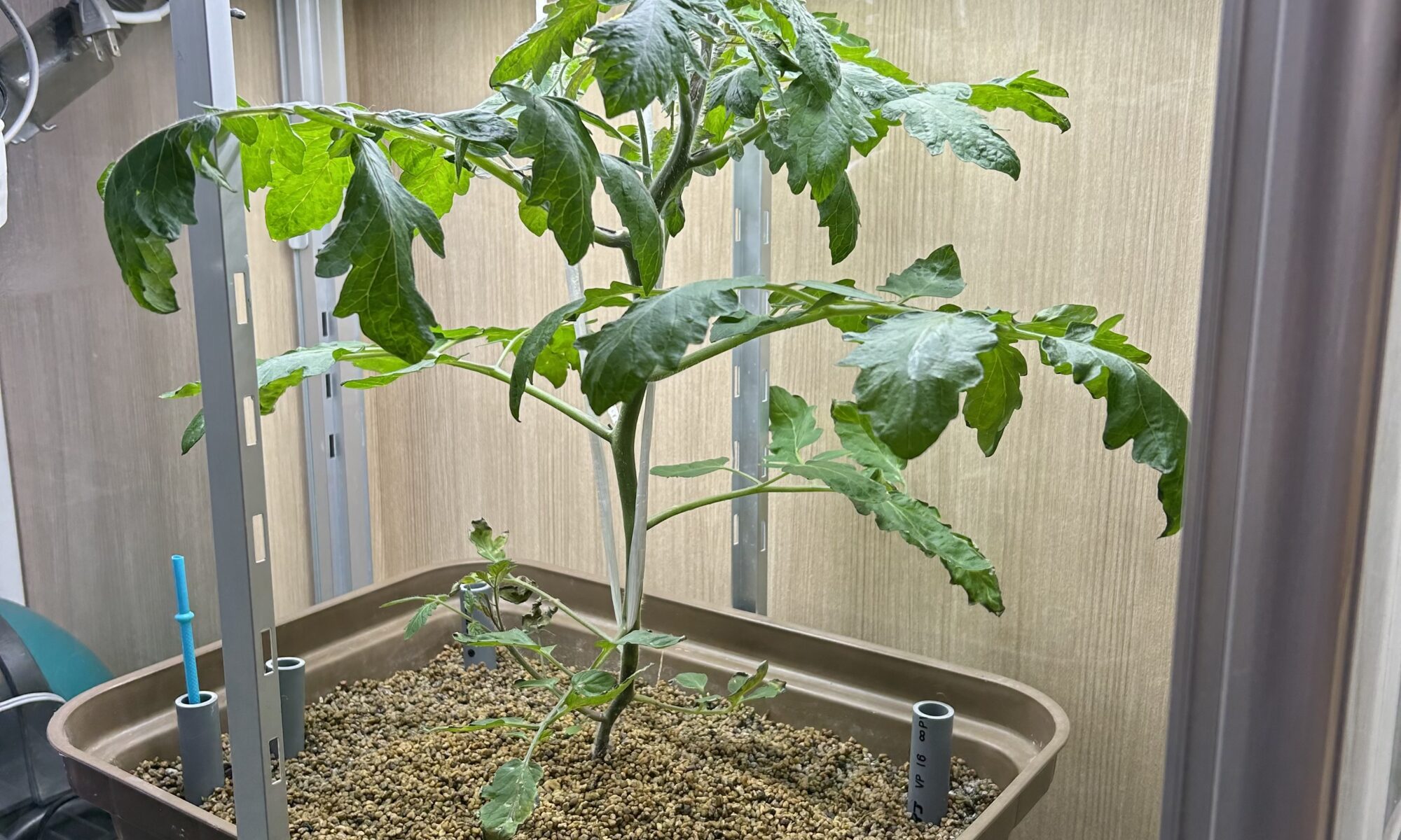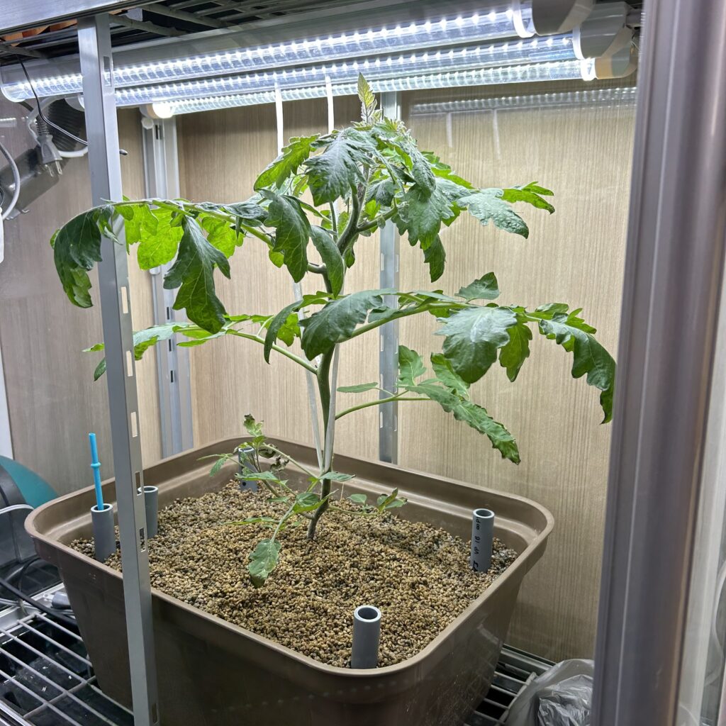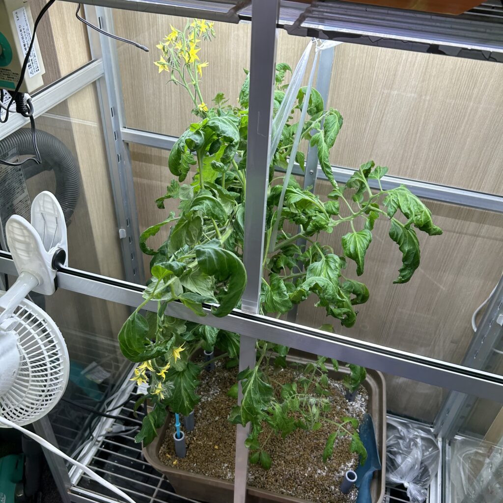完全室内栽培なので、育成ライトは必須です。キット1つに対して、おやさいライトを2本当てています。ミニトマトは光が大好きな植物ですので、明るい窓際では育ちません。育成ライトを使わない場合は、半日程度は直射日光の当たる場所に置いてあげてください。